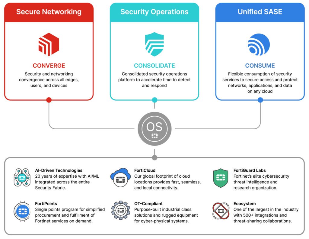 - Unmatched Convergence: Fortinet unifies networking and security into one Security Fabric, reducing gaps and simplifying enterprise management.